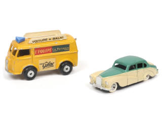 comprend : ROLLS ROYCE SILVER CLOUD (modèle original) & PEUGEOT D4A 'VOITURE BALAI' (version avec plancher en plastique marron clair - publicités 'PLASTIQUE GILAC - L'EQUIPE & LE PARISIEN' - avec manques - traces d'oxydation sur un axe de roues)