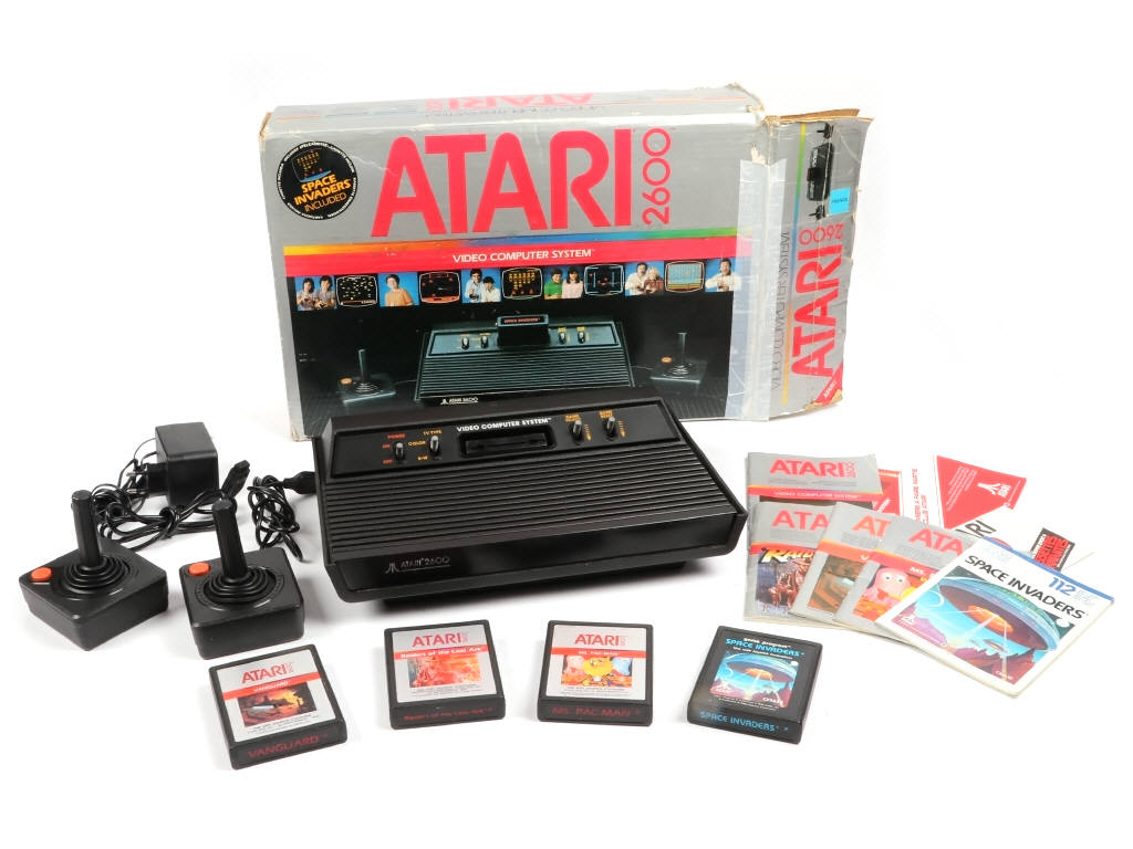 non testé - comprend la console avec 2 manettes, bloc d'alimentation, 4 jeux (VANGUARD, RAIDERS OF THE LOST ARK, MS PAC MAN & SPACE INVADERS) & leurs notices - avec catalogue, dépliant, notice & carte de garantie - boite en état 'd' avec parties déchirées & manquantes, ruban adhésif & cale