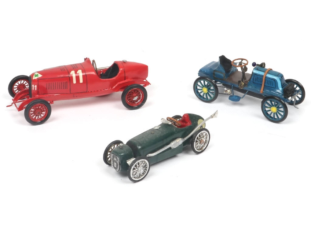 créations artisanales en bois - absence d'inscription MERCATOR sur 2 planchers - comprend notamment les modèles : ALFA ROMEO & MORS - une roue à recoller sur un modèle (manque extrémité d'axe)