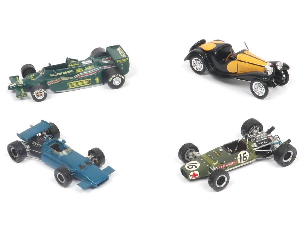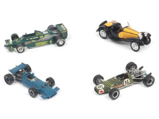 créations artisanales en bois - absence d'inscription MERCATOR sur les planchers - un modèle sans saute-vent - comprend notamment MASERATI 8C F1 - on y joint une LOTUS 'MARTINI' de la marque ELIGOR (kit résine - production EVRAT) & une BUGATTI de la marque DUBRAY (réalisation en résine avec plancher en métal)