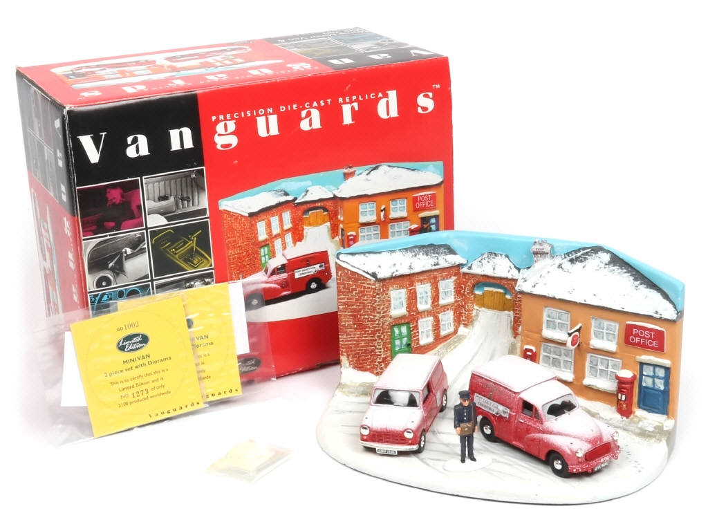 contient : MORRIS MINI van, MINOR van, diorama, figurine, certificats d'édition limitée à 2100 exemplaires & sachets de rétroviseurs