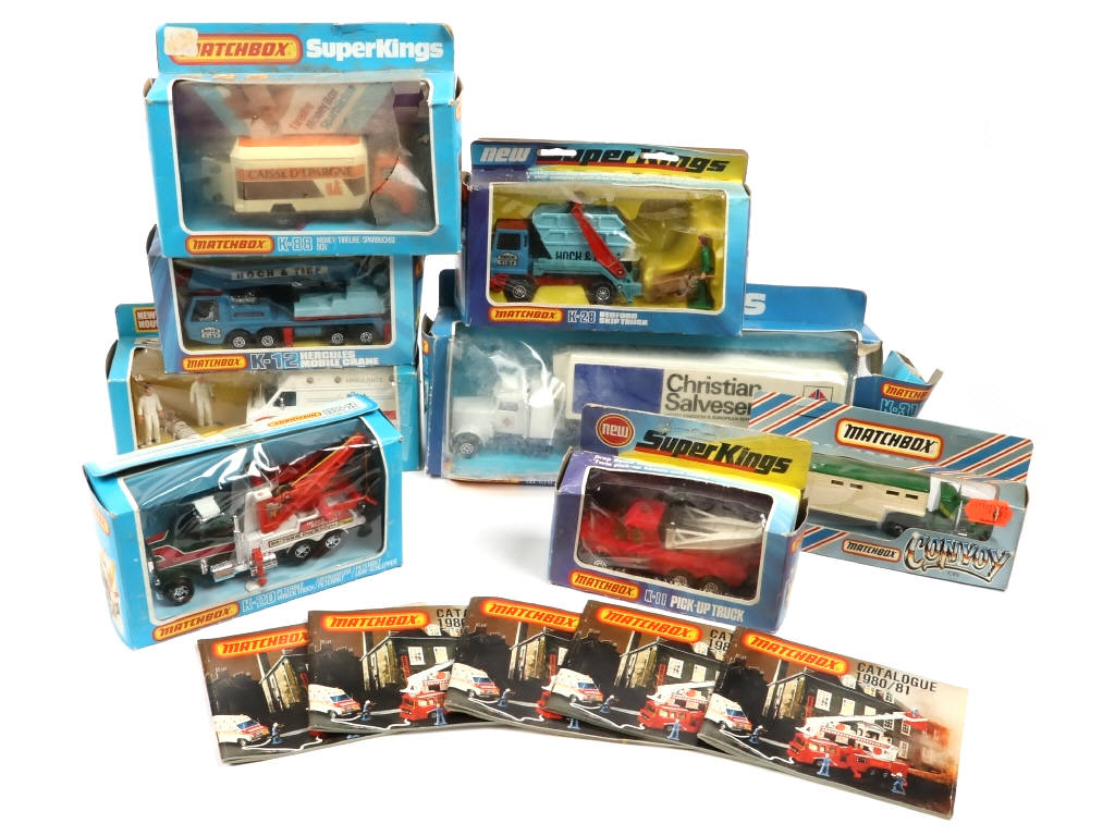 comprend notamment les modèles : DODGE ambulance, tirelire, PICK-UP TRUCK & BEDFORD SKIP TRUCK - on y joint 5 catalogues de la marque (1980/81) de 77 pages 15X11 cm - boîtes encrassées, déformées avec tâches d'humidité en états 'c' & 'd'