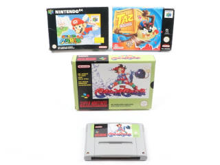 versions françaises - testés : fonctionnent - comprend : CRAZY CHASE (déchirure près d'un rabat à l'arrière de la boite), TAZ EXPRESS & SUPER MARIO 64 (cale de boite non d'origine - cartouches en très bon état général, étiquettes en très bon état - boites en états de 'b' à 'c' (accrocs & frottements) avec notices & cales