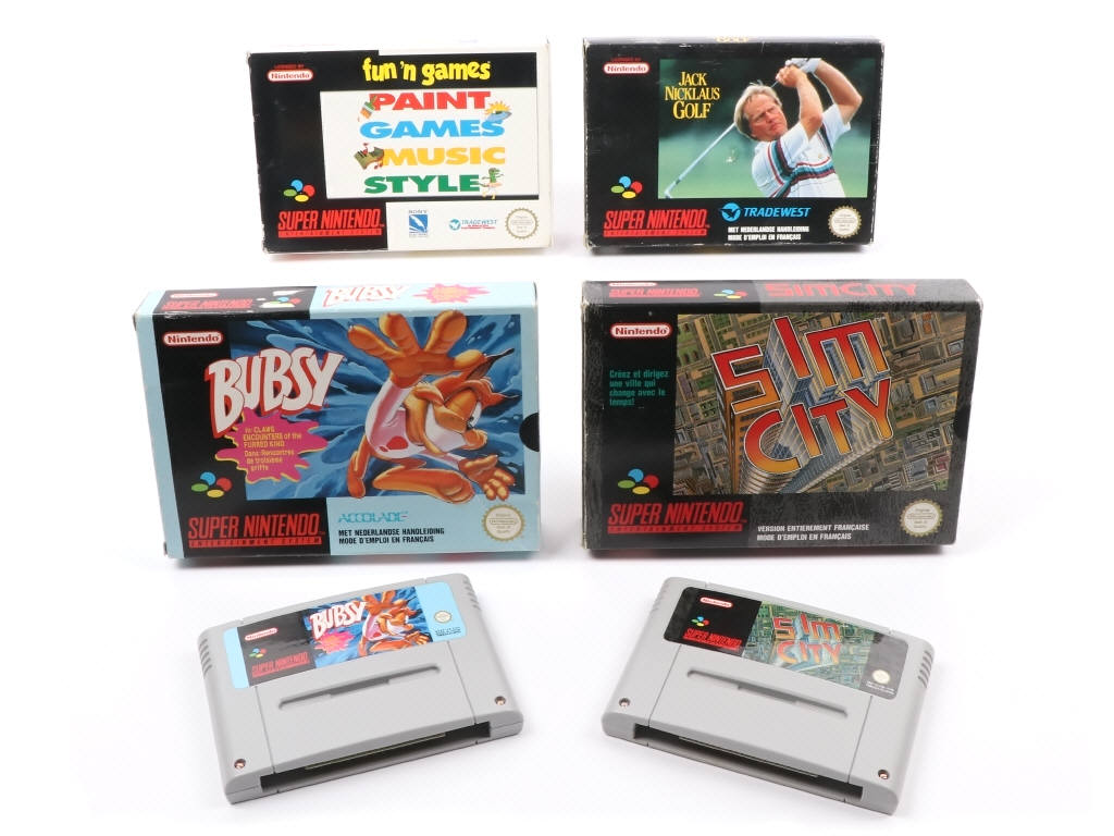 versions françaises - testés : fonctionnent - comprend : BUBSY, SIN CITY, FUN'N GAMES & JACK NICKLAUS GOLF - cartouches en très bon état général, étiquettes en très bon état - boites en états de 'b à c' (accrocs & frottements) avec notices & cales