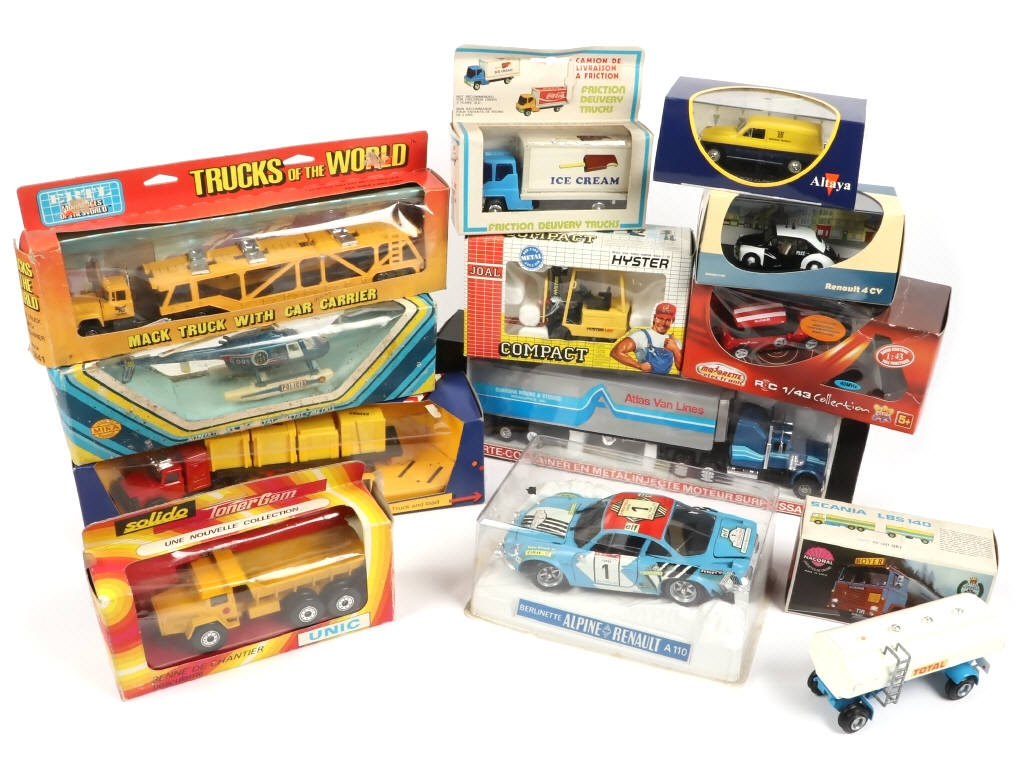 comprend notamment les marques : MAJORETTE, SOLIDO, MIRA, JOAL & ERTL - on y retrouve : camions semi-remorques, hélicoptère & voiture de rallye - boîte encrassées (pour certaines) en états 'a' à 'c'