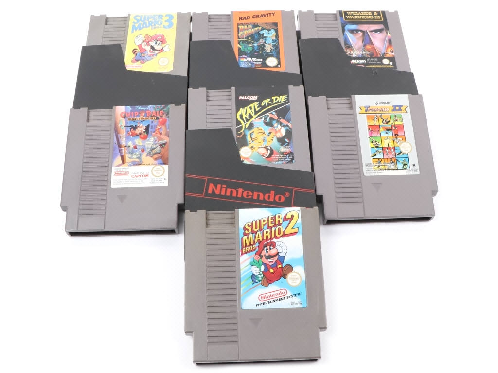 version française - testé : fonctionnent - comprend : SUPER MARIO BROS 2, CHIP 'N' DALE, SKATE OR DIE (petit accroc sur l'étiquette), TRACK & FIELD II, WIZARDS & WARRIORS III (petits accrcos sur l'étiquette), RAD GRAVITY & SUPER MARIO BROS 3 (étiquette avec important manque de papier, frottements) - ensemble plus ou moins encrassé - 3 étuis non d'origine & 3 jeux sans étuis
