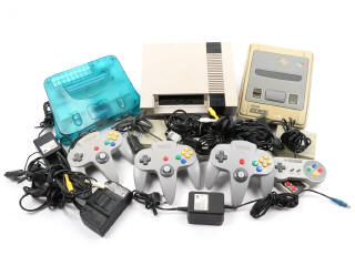 non testé : comprend : 3 consoles NINTENDO (64, NES & SUPER NINTENDO), 5 manettes, 2 NINTENDO SCOPE & alimentations - ensemble encrassé - avec manques & parties cassées