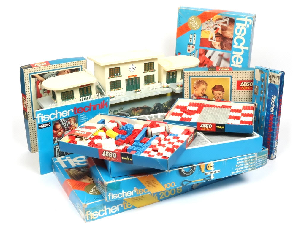 les boîtes sont en états 'b' & 'c' - on y retrouve les marques : LEGO & FISCHER - on y joint une gare en plastique (parties plus ou moins jaunies avec quelques éléments cassés & manquants, boîte en état 'd', système électrique non testé) de la marque GEGE - avec éléments manquants
