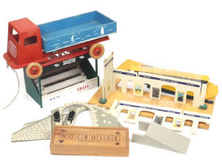 comprend : notamment camion benne basculante en bois (longueur : 38 cm), tribune 'SCALEXTRIC - SHELL', éléments de tunnel avec feux tricolores (fabrication en plastique), éléments de gare (fabrication en isorel - avec éléments manquants) & jeu 'MOTS CROISES' (fabrication en bois) - on y retrouve notamment les marques : SCALEXTRIC & HORNBY