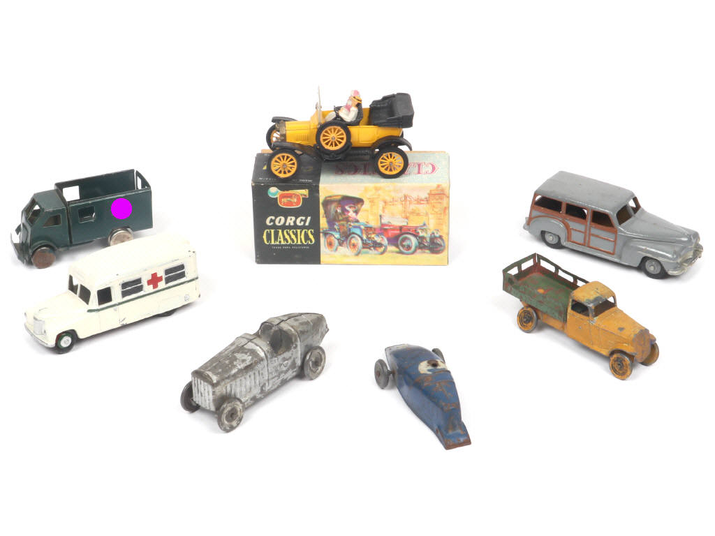 différentes compositions - comprend notamment les modèles : FORD (boite en état 'b'), DAIMLER & PLYMOUTH - on y retrouve notamment les marques : JOUETS CITROEN, A.R & CORGI TOYS - avec manques, parties cassées & oxydées