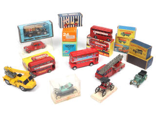 comprend notamment les modèles : OLDSMOBILE, FORD, RICHIER, CITROEN, CROSLEY, BERLIET & ROLLS ROYCE - on y retrouve les marques : ELIGOR, RIO, SOLIDO, BUDGIE MODELS, LONESTAR, ZISS MODELL, MATCHBOX & MINIALUXE - avec quelques manques & parties cassées - boites en états 'b' à 'd' (2 modèles sans) - on y joint 3 boites vides de la marque MATCHBOX (références : 1, 2 & 66) en état 'b'