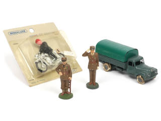 pneus séchés, salis, craquelés & plus ou moins endommagés - on y joint un motocycliste de course sur sa moto (état 'A-'-'c', blister jamais ouvert, froissé, guidon cassé & incomplet) de la marque MINIALUXE & 2 figurines (général de Gaulle & maréchal Leclerc, état 'R') de la marque QUIRALU