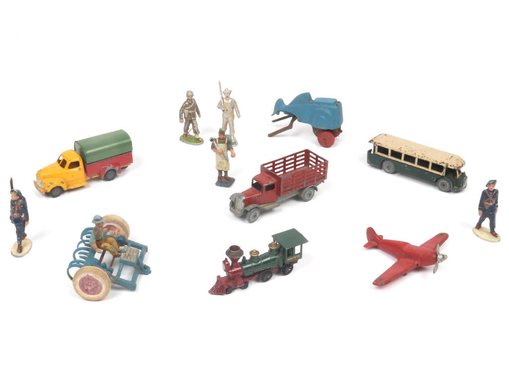comprend notamment les modèles : STUDEBAKER (1er type), camion benne bétaillère & locomotive américaine 4-4-0 - on y retrouve notamment les marques : DINKY TOYS, QUIRALU & MATCHBOX - avec manques, parties cassées & oxydées