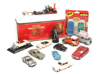 on y retrouve notamment les marques : CORGI TOYS, NOSTALGIE, MERCURY & SOLIDO - 3 exemplaires avec boîtes (état 'c') - quelques manques & parties cassées (suivant les modèles) - on y joint une figurine de BATMAN (kiosque)
