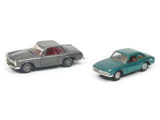 comprend : FIAT coupé 1200 S. O.S.I. & MERCEDES-BENZ 230 SL (quelques petits manques de pellicule chromée sur les pare-chocs & détails de peinture ajoutés sur la plaque minéralogique avant & le sigle de calandre - une portière en partie vernissée)