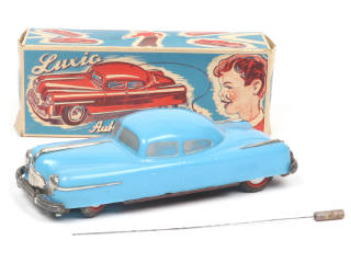 longueur 25,5 cm - réalisation en plastique & bakélite - avec système de tringles (incomplet) permettant de faire avancer la voiture tout en la dirigeant (avec bruiteur) - chromes des pare-chocs ternis - un petit défaut de moulage sur une jante - manque la plupart des vis de plancher & certaines non d'origine