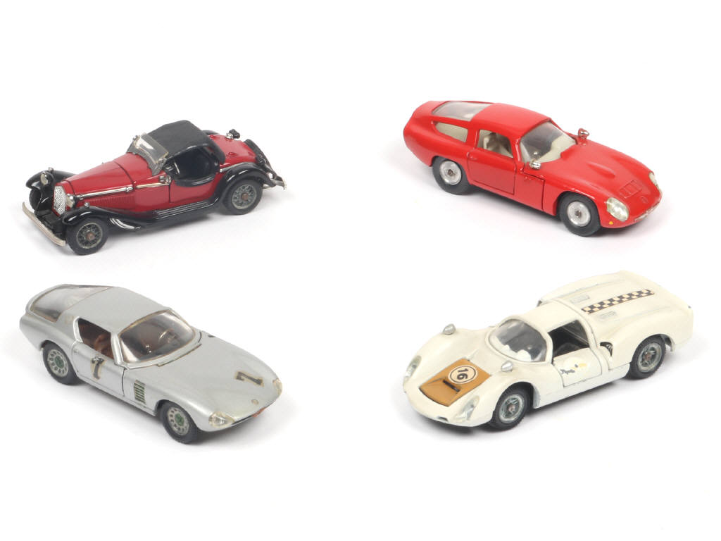compend les modèles : ALFA ROMEO (dont une avec petites fêlures sur les phares & une autre avec rétroviseur manquant) & PORSCHE (manque certains déclaques) - quelques pneus séchés - on y retrouve les marques : POLITOYS & MEBETOYS