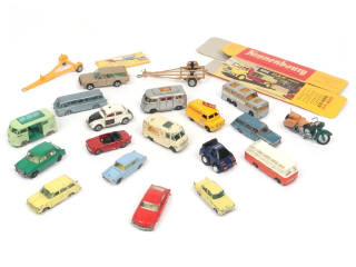 on y retrouve notamment les marques : MATCHBOX, MAJORETTE, HUSKY & CORGI TOYS - avec manques & parties cassées - on y joint un catalogue C.I.J/NOREV & une boite vide de la marque DAN-TOYS (référence 029)