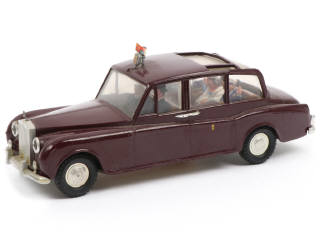 avec figurines représentant la famille royale - système électrique non testé (traces d'oxydation) - mauvais rivetage (traces de colle) - mascotte de radiateur fragilisée & drapeau de toit légèrement déformé - calandre plus ou moins ternie - avec roue de secours dans la malle arrière (petits & éclats à la base)
