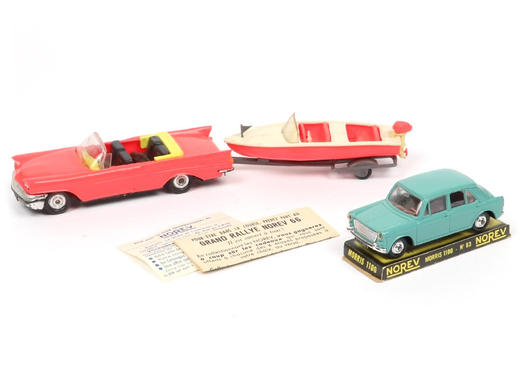 comprend : MORRIS 1100 (boite en état 'b') & CHRYSLER NEW YORKER (manque un feu arrière & pellicule argentée par endroits) avec DINGHY ROCCA sur remorque