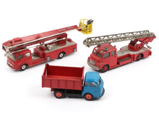 comprend : SAVIEM JM240 Benne charbonnière (quelques retouches par endroits, manques de peinture sur le châssis & la tige de basculement, RARE !), TURNTABLE FIRE ESCAPE (parties ternies, manivelle d'échelle déformée) & SIMON SNORKEL - on y retrouve les marques : C.I.J, DINKY TOYS GB & CORGI TOYS - carrosseries encrassées & parties oxydées