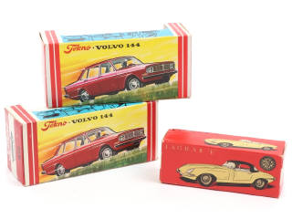 comprend : JAGUAR TYPE E & VOLVO 144 (2 exemplaires identiques) - déformations, accrocs & petites déchirures - blisters intacts mais déformés
