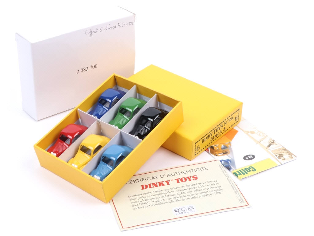 contient : 6 SIMCA 5 (3 avec roues noires & 3 avec roues blanches) - avec certificat d'authenticité, cales de boite, dépliant présentant le coffret & surboite (inscriptions)