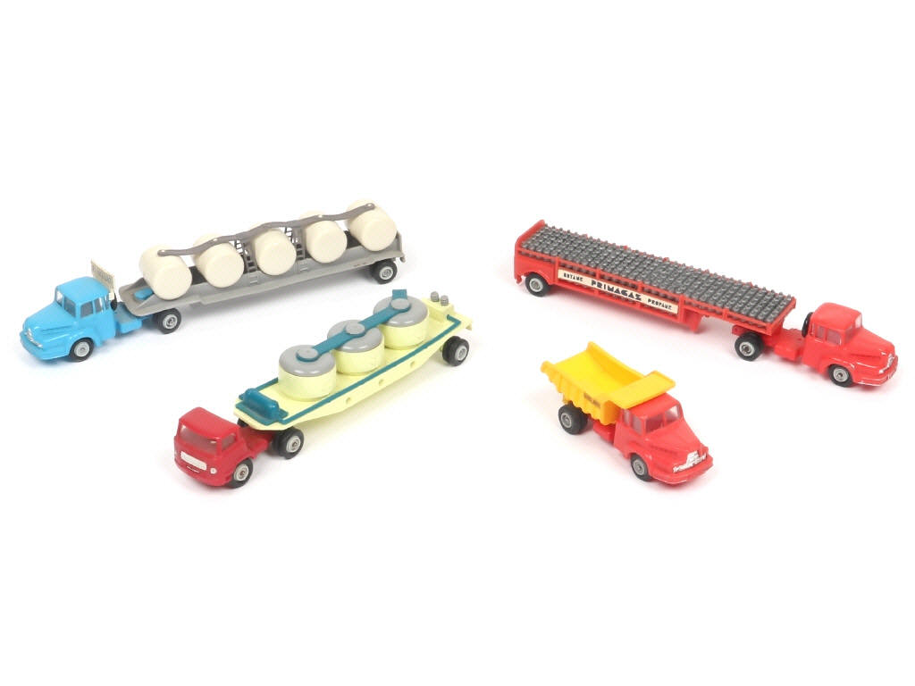 série 'MICROMINIATURES' - ensemble légèrement encrassé - comprend : 'BENNES MARREL', semi-remorque 'FRANCE LAIT', 'PRIMAGAZ' & containers à ciment - traces de ruban adhésif sur 2 toits de cabine - manques certains autocollants