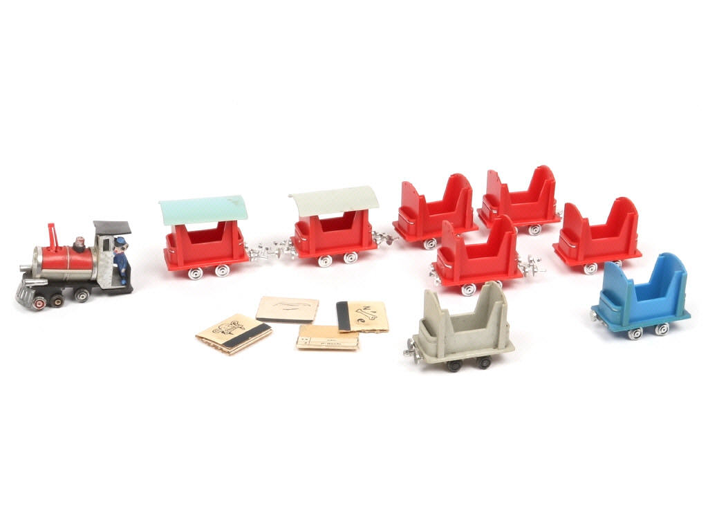 issus du petit train de Maurice BRUNOT 'INTERLUDE' - comprend : locomotive à vapeur & 8 wagons - avec manques & parties cassées