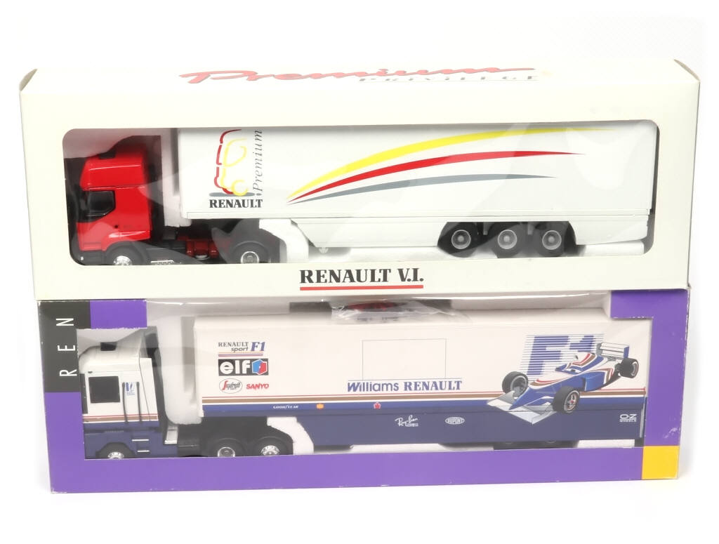 comprend les modèles : AE 'WILLIAMS RENAULT' (2 agrafes sur un rabat de boîte) & H100 'RENAULT PREMIUM' - avec sachets d'accessoires & petits catalogues
