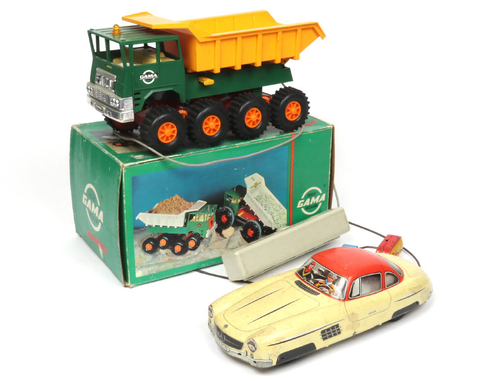 grandes échelles - comprend : FAUN 8x8 benne carrière (état 'B'-'b', avec moteur à piles fonctionne, une courroie coupée n'entraînant pas l'autre train roulant, petites restaurations dans le compartiment à piles, accrocs sur la boîte) & MERCEDES 300 SL (état 'D', propultion par câble fonctionne, retouches, une roue manquante, sans boîte) - on y retrouve les marques : GAMA & ARNOLD (FRANCE)