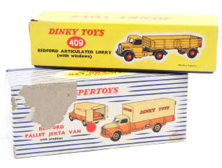 comprend : BEDFORD ARTICULATED LORRY réf 409 (déchirure dans un angle) & BEDFORD PALLET JEKTA VAN réf 930 (avec cale - important manque de papier sur une face)