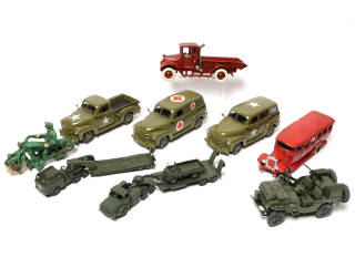 différentes échelles - comprend notamment les marques : DINKY TOYS, SOLIDO & MIRA - on y retrouve notamment les modèles : TOUS TERRAINS BERLIET, MERCEDES UNIMOG & CHEVROLET PANEL TRUCK - on y joint : 3 véhicules en fonte en états 'R' (reproductions) - possibilité de petits manques & parties cassées