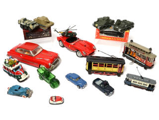 différentes échelles - comprend notamment les marques : SOLIDO, REXTOYS, SPOT-ON & C.I.J. - on y retrouve notamment : chars, hélicoptère, trams & voitures - manques, retouches pour certains modèles & parties cassées