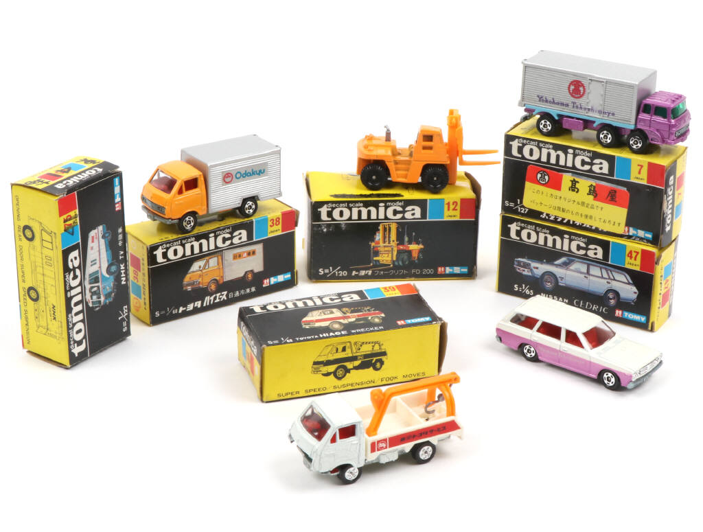 comprend : NISSAN CEDRIC & FUSO PANEL VAN promotionnels 'YOKOHAMA TAKASHIMAYA', TOYOTA FORKLIFT FD200 (boite déformée), TOYOTA HIACE "ODAKYU" & WRECKER (état 'e', importantes traces de métal fatigue) - boite vide de MHK TV (inscription & étiquette collée) - quelques accrocs & frottement sur les boites