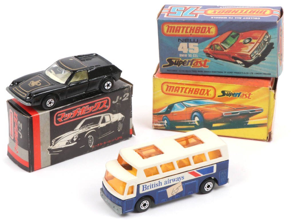 comprend : LOTUS EUROPA pour le marché japonnais (plancher plus ou moins terni - boite très encrassée), autobus 'BRITISH AIRWAYS' pour le marché brézilien (petite plaque en plastique ajoutée sur le plancher avc inscription 'B ZF MANAUS' & sa boite référence 75 changée en 65 avec petites étiquettes, encrassée & déformée) - on y joint une boite vide de BMW 30 CSL