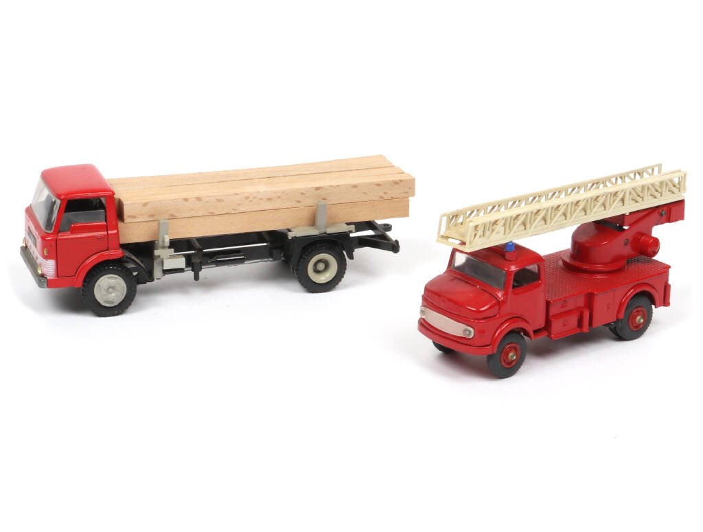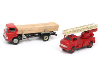comprend : MERCEDES 1113 grande échelle de pompiers & FORD D 800 fardier - avec son chargement (manque chaînes - quelques parties ternies) - on y retrouve les marques : VILMER & KIRK