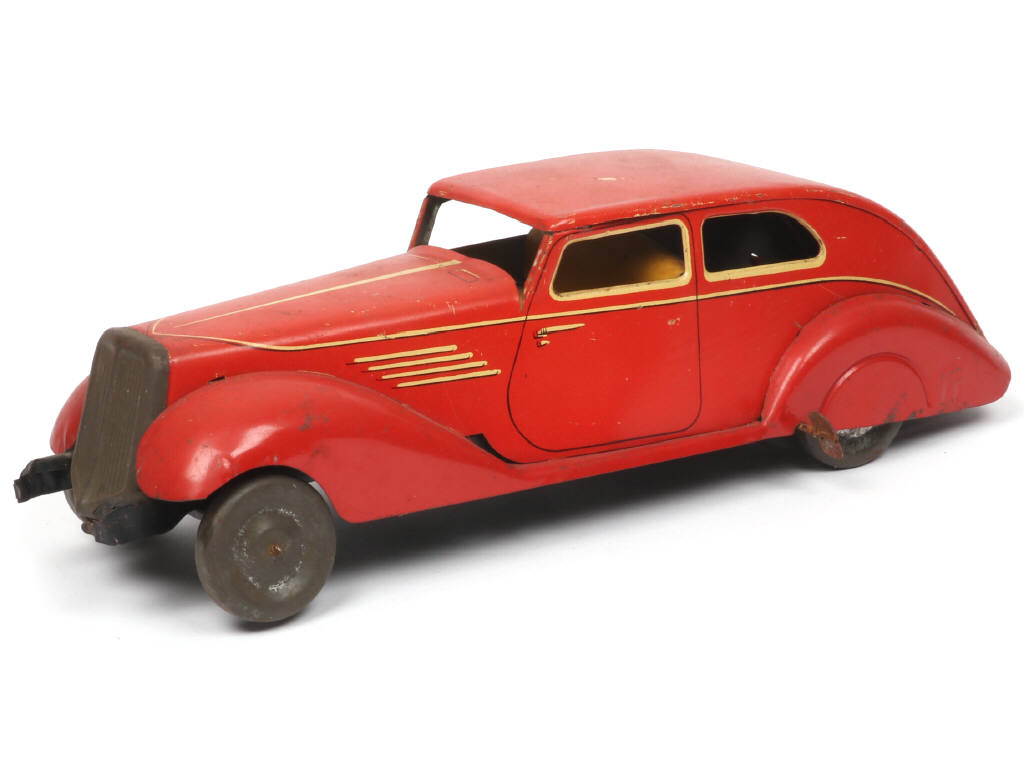 longueur : 34 cm - avec moteur à ressort (fonctionne) & direction - parties chromées ternies - manque pare-choc avant - quelques petites traces d'oxydation par endroits