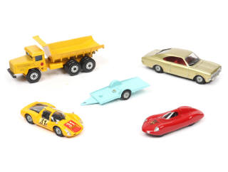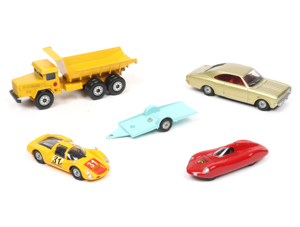 comprend notamment : FIAT ABARTH des records, PORSCHE CARRERA 6 (un petit manque sur un décalque de portière), camion UNIC benne carrière & OPEL COMMODORE coupé