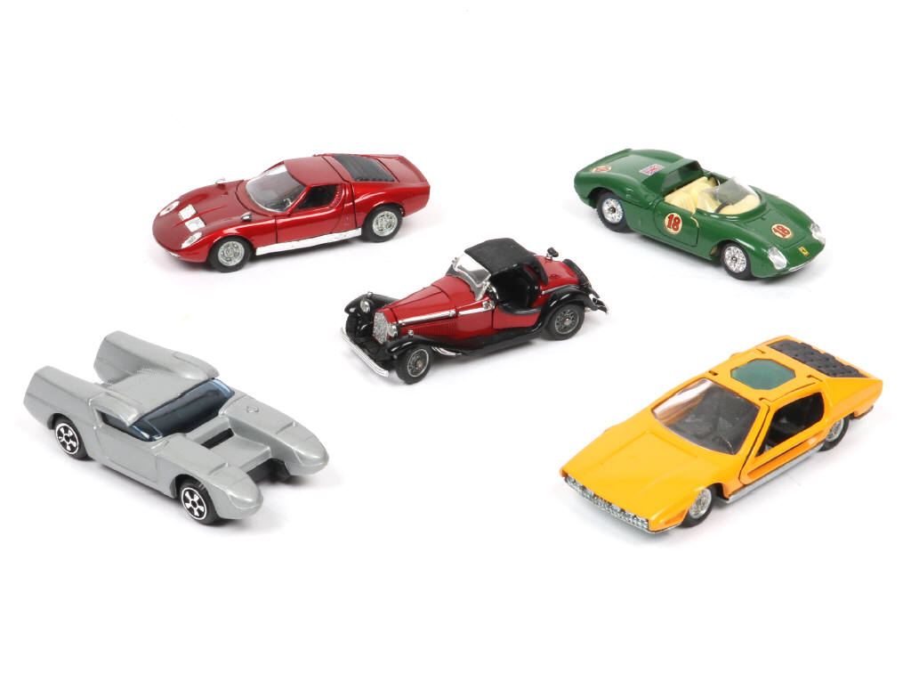 comprend notamment les modèles : FERRARI (micro-fissures sur une extrémité de pare-brise avec léger manque à un endroit), LAMBORGHINI, OSI BISILURO & ALFA ROMEO (un défaut dans la fermeture d'une portière) - on y retrouve les marques : MERCURY, POLITOYS & POLISTIL