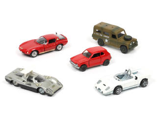 comprend les modèles : LAND ROVER (quelques accessoires manquants), FORD, PANTHER, ALFA ROMEO (décalques ajoutés) & HONDA (état 'R') - on y retrouve les marques : POLITOYS, MEBETOYS & MERCURY - quelques retouches