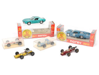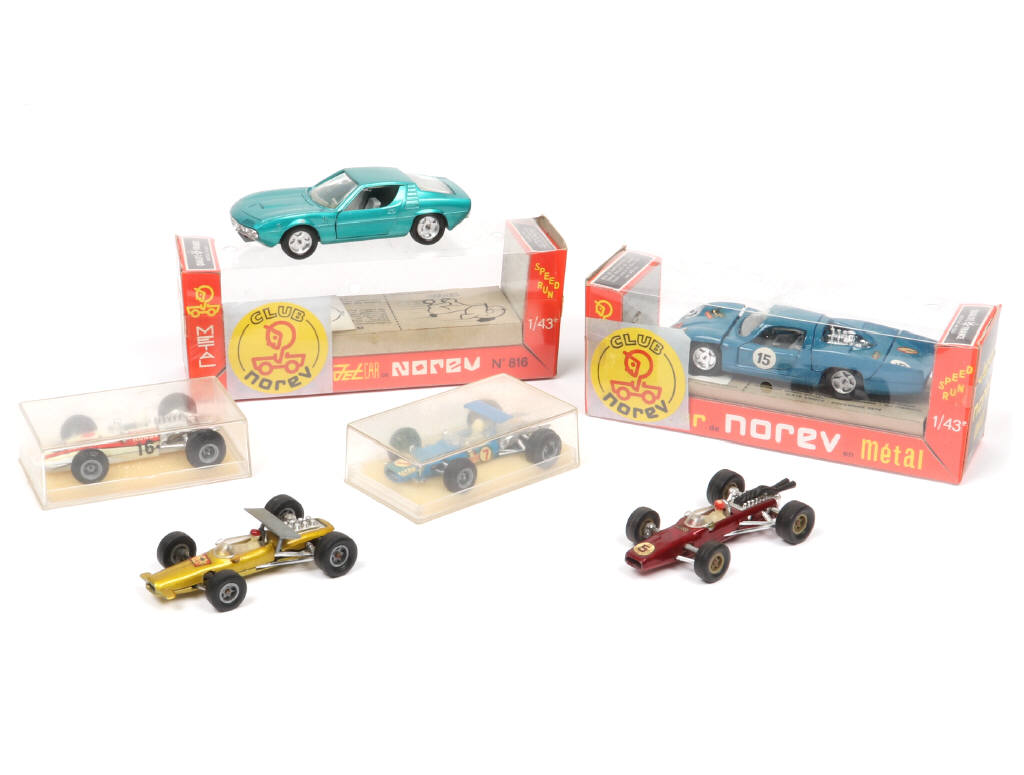comprend notamment les modèles : HONDA, RENAULT ALPINE (vitre de hayon à repositionner), ALFA ROMEO MONTREAL & LOTUS - boites en état 'b' (2 modèles sans) - on y retrouve les marques : NOREV JET-CAR (avec bulletin imprimé sur cale du 'GRAND JEU NOREV' de 1974 avec partie représentant le personnage 'COMETE'), MAJORETTE & CHAMPION