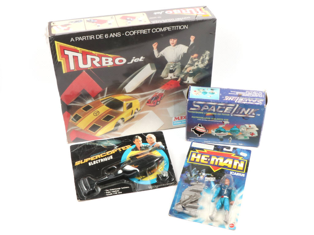 comprend : TURBO JET (neuf sous blister), SPACE LINK réf : 273675 (encrassé & incomplet), SUPERCOPTER (neuf sous blister, unpunché) & HE-MAN réf : 2275 (neuf sous blister) - on y retrouve les marques MECCANO, VULLI & MATTEL - les boites sont en états de 'b' à 'c' avec accrocs, petites déchirures & frottements