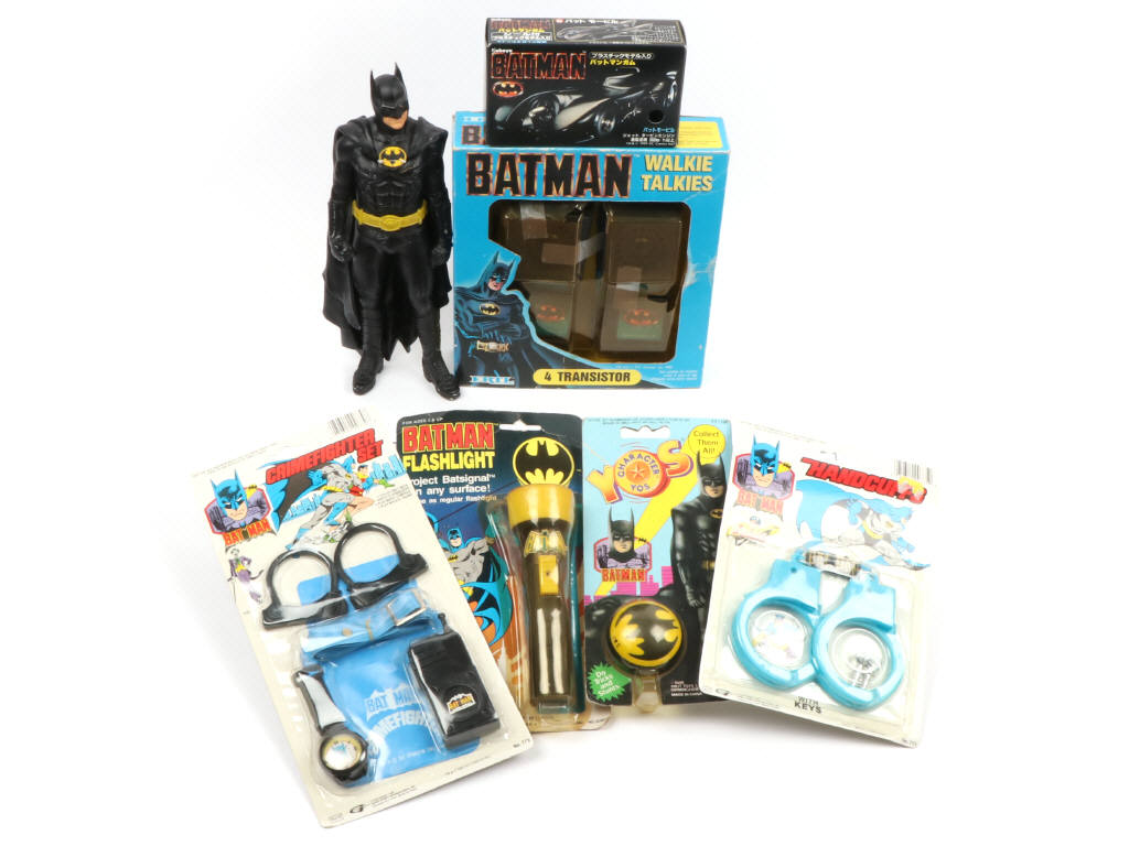 comprend notament : une statuette de 29 cm de hauteur (manque important de peinture & parties recollées), TALKIES WALKIE (neuf avec notice, blister jauni & incomplet), CRIMEFIGHTER SET réf : 779 & un YOYO - les boites sont en états de 'b' à 'c' avec frottements, déchirures & manques de papier