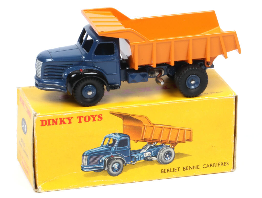 DINKY TOYS (FRANCE) 34A BERLIET Benne carrière MARREL (version avec jantes convexes) bleu foncé & orange