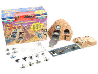 comprend : LA BASE SECRETES réf : 96-742 (complète avec notice, accessoires & 4 véhicules militaires toujours fixés sur leur socle - quelques traces d'utilisation - boite en état 'b' avec accros, frottements & étiquette revendeur) & 18 avions