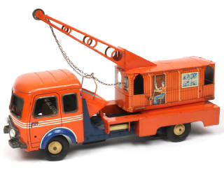 longueur : 45 cm - avec moteur à clef (fonctionne, une clef fixée sur l'axe de remontage), godet, phares électriques (non testés) & direction - parties chromées ternies (principalement la calandre) - base de la flêche restaurée & retouchée - toit de grue repeint (quelques retouches par endroits)