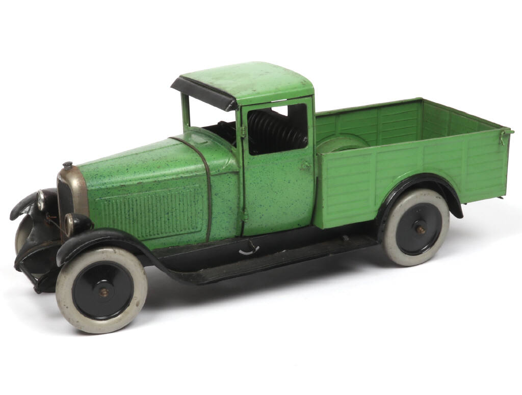 longueur : 42 cm - version avec roues pleines en tôle - avec moteur à clef (fonctionne), direction, portière conducteur ouvrante & phares électriques (non testés, manque une vitre, un câble coupé & non d'origine) - un entourage de phare & volant non d'origine - carrosserie plus ou moins encrassée avec très légères restaurations par endroits - manque ficelle de bandage de roue