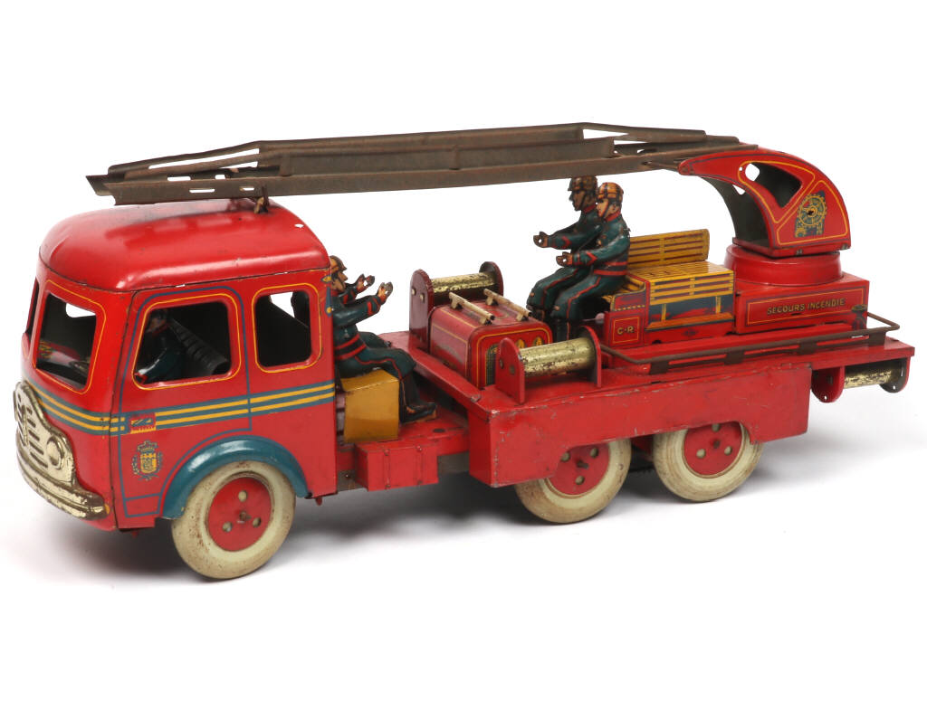 longueur : 45 cm - avec moteur à clef (fonctionne), direction & 5 pompiers présents - parties dorées & chromées plus ou moins ternies - quelques accessoires manquants (dont un élément d'échelle, vis de support non d'origine) - traces d'oxydation par endroits