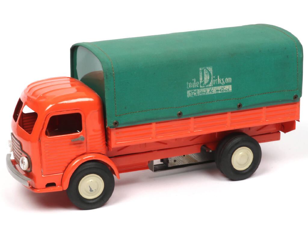 longueur : 33 cm - avec moteur à clef (fonctionne), phares électriques (non testés) & direction - une charnière de portière conducteur cassée & manquante (petites traces de colle sur le pourtour de l'encadrement de portière) - un petit manque de peinture sur une jante - grille de calandre & rivets de bâche ternis - pneus plus ou moins craquelés - une petite restauration dans le logement à pile